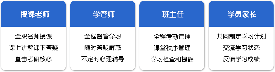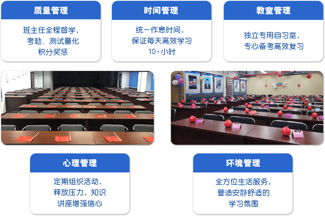 报考指导+班主任课堂管理+ 每天考勤打卡+预约试卷批改+ 北京老师线上课程+专属自习室等