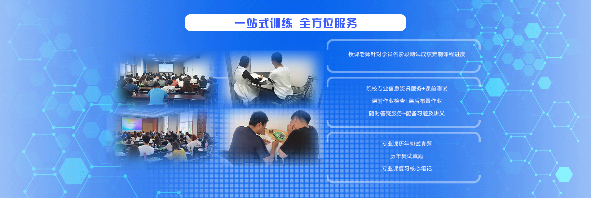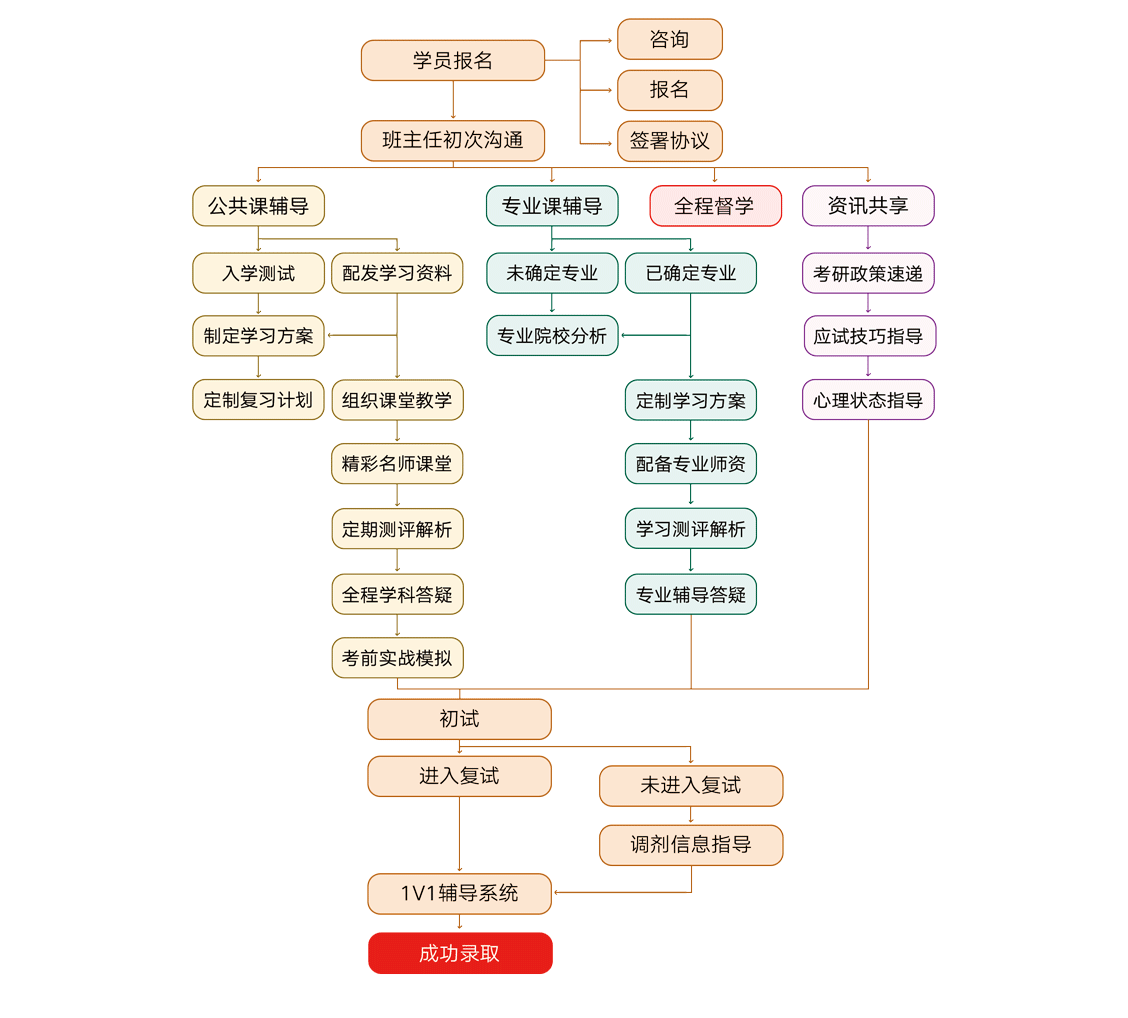 ①全科精品面授课程:基础精讲+强化训练+模考测评提高+冲刺课程+英语作文预测+复试基础课程 ②西医综合小班专业课:专业授课,择校指导+院校匹配 ③经验学管师督学:规划、监督、检验学习成果 ④配套图书讲义资料:教研院制定针对性教学、精编辅导讲义 ⑤跟踪测评:及时发现知识盲点 ⑥线上线下监控互动答疑:专业教研团队,随时解决考研疑问 ⑦专属服务协议:教学服务质量好 |