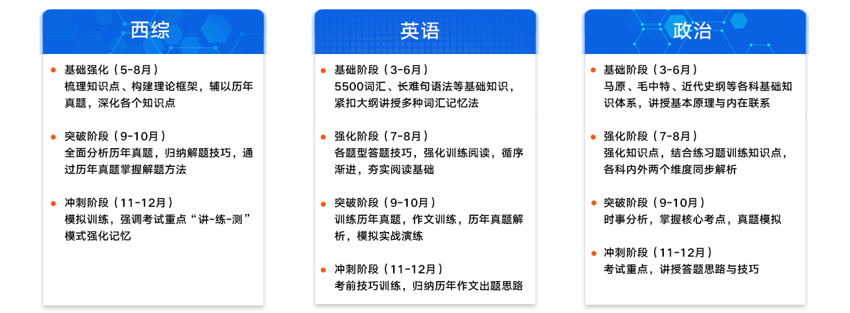 西综全科暑期营+ ⑧全科加长课时 ⑨专业课一对一指导:针对性查缺补漏 ⑩寒假先锋营:快速适应考研学习节奏,夯实基础 ⑪暑期集训营:全实力师资授课,考点、难点、重点快速吸收 ⑫全国实力师资阶段面授:汤家凤等全国实力师资亲临指导 ⑬历年真题三年模拟:历年真题全面解析,适应考试氛围 |